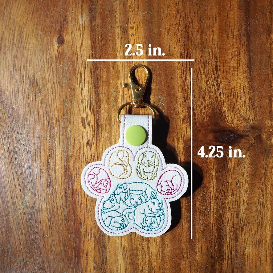 Each design is embroidered directly onto marine vinyl, then cut out by hand (so no two are exactly alike!). I finish them off with a coordinating button and key ring. While they are made to be sturdy for everyday use, try to go easy on the button closure to keep it looking its best.