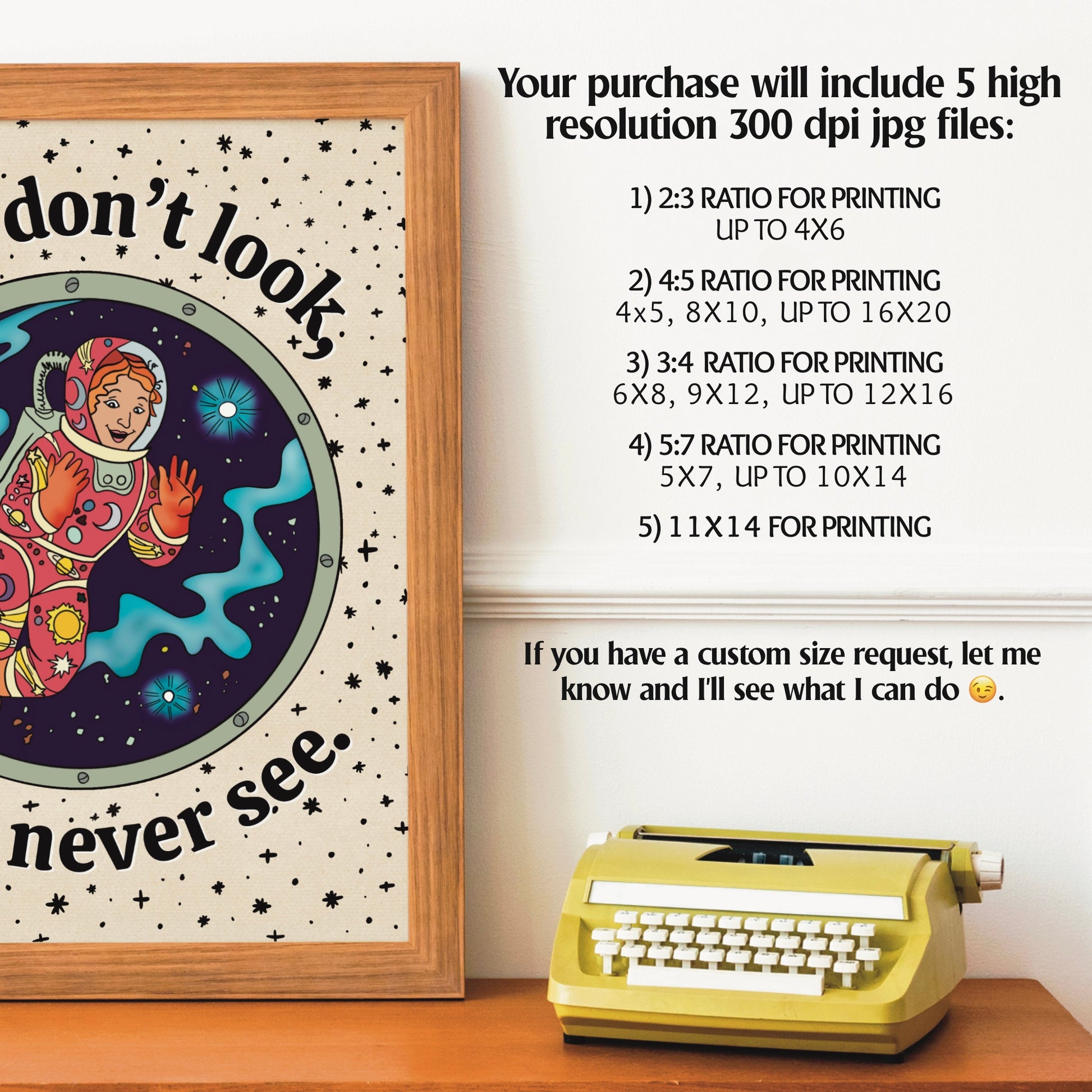 Once purchased, you’ll receive a ZIP file with 5 different files that allow you to print according to the sizes listed below. All files are JPEG, have a 300 DPI resolution and CMYK color profile for printing.