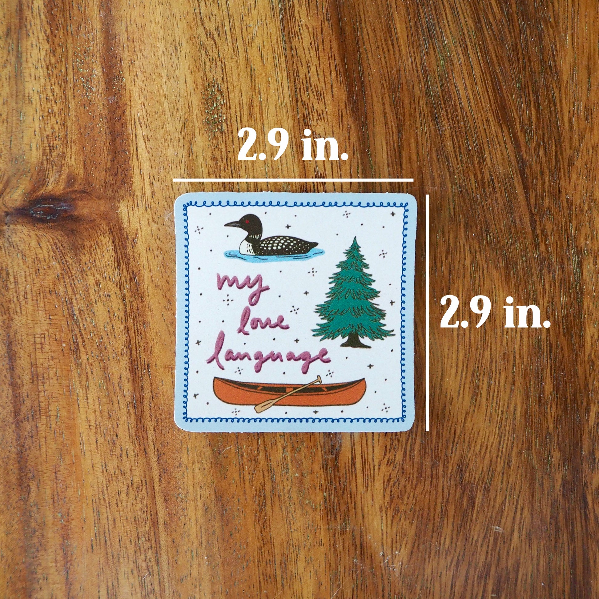 Speak the language of the lake with this adorable sticker! Measuring 2.9 x 2.9 inches with a glossy finish, this little design pairs loons, trees, and a canoe with intentionally uneven edges for that perfectly imperfect, hand-cut look.