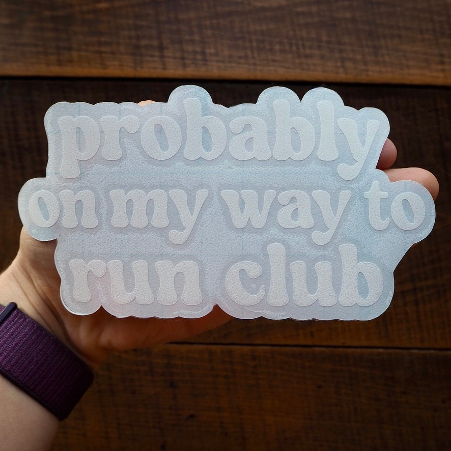 For the runners who are always headed to run club (or at least thinking about it). This vinyl decal is perfect for your car’s back windshield, but also works great on laptops, mirrors, or wherever you want to show off your love for your local run club. It is made from a matte vinyl and measures about 5.8 in. wide by 3 in. tall.
