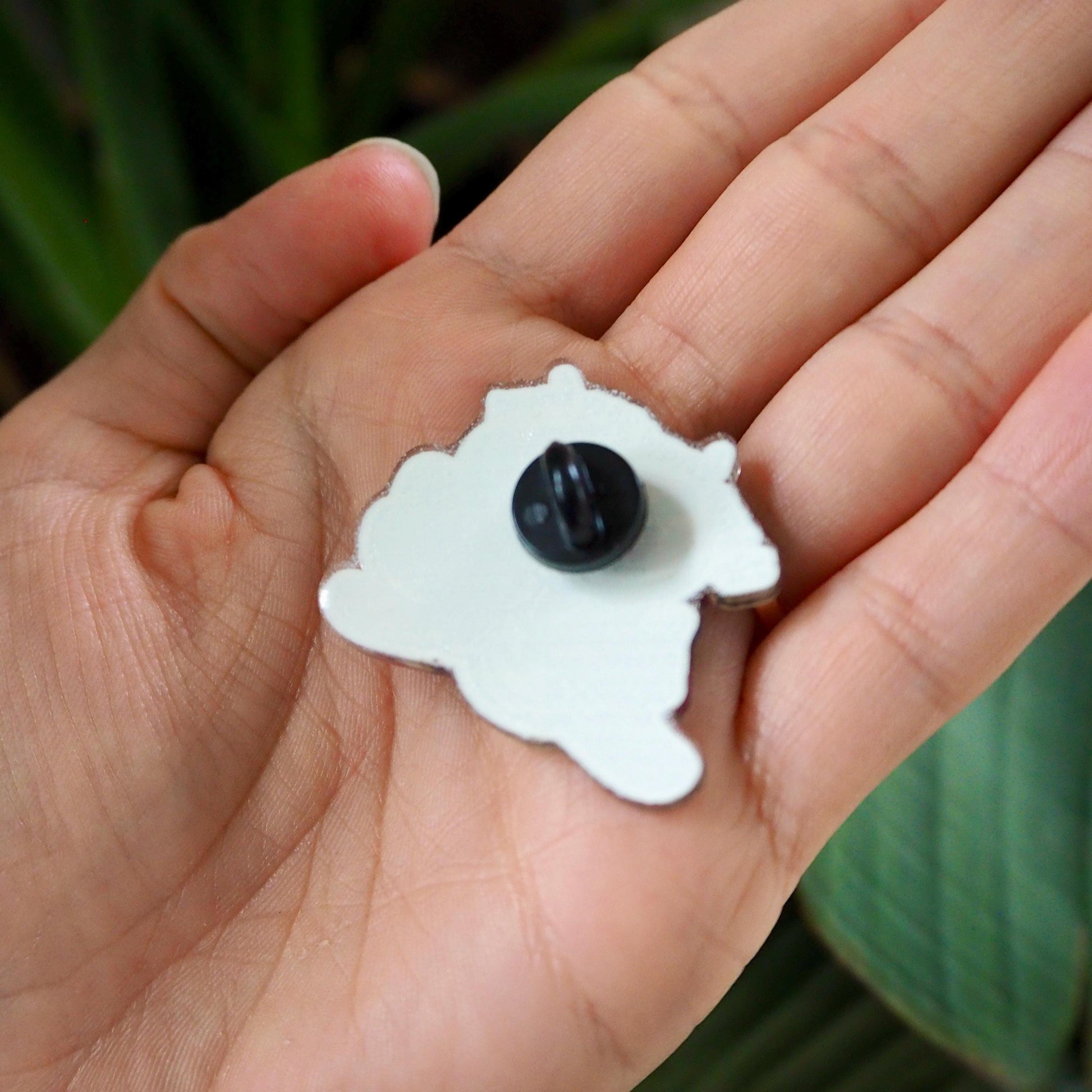 The pin is made of durable acrylic, measures 1.25 x 1.5 inches, and has a glossy finish. Plus, it comes with a blue peel-off protective layer to keep it safe during shipping.
