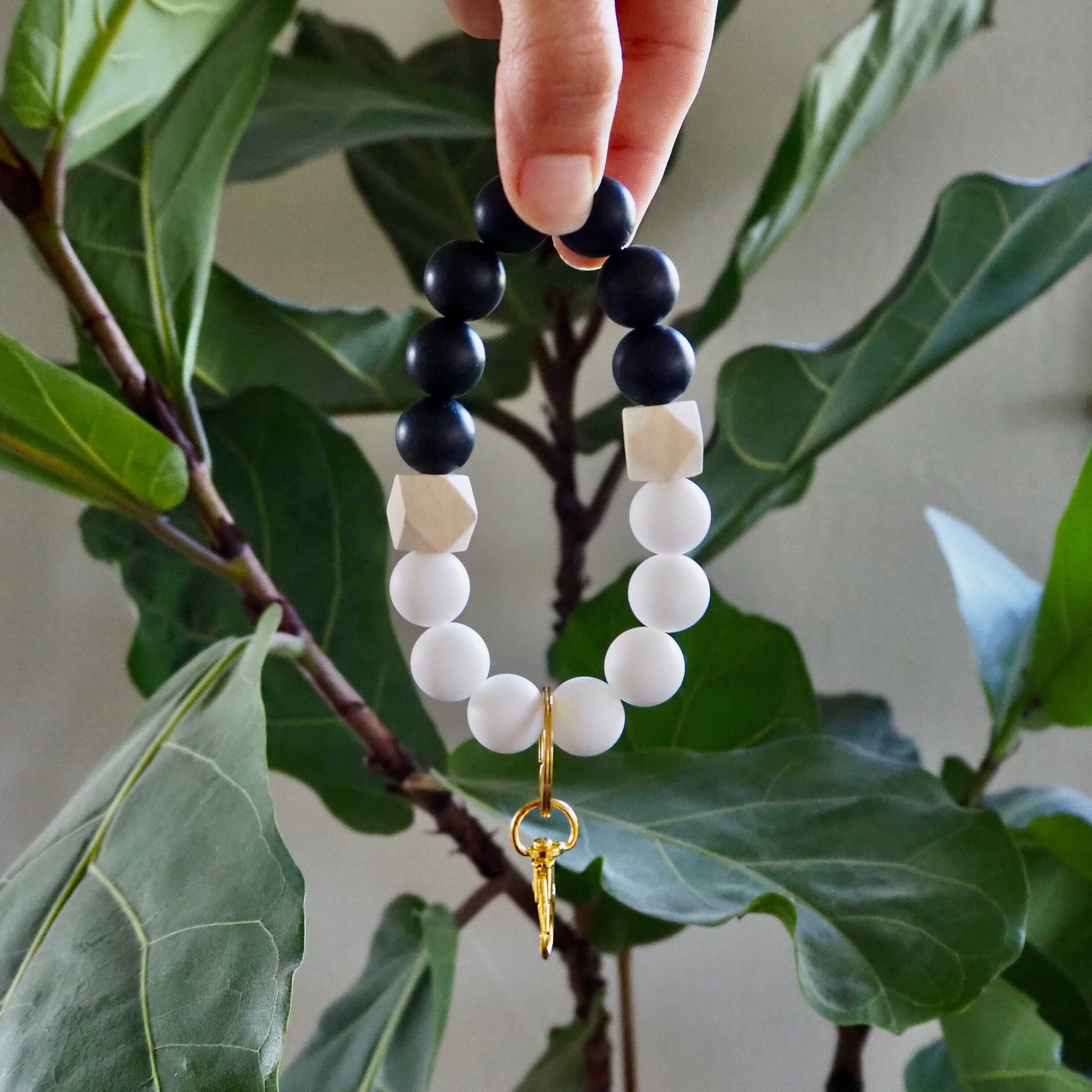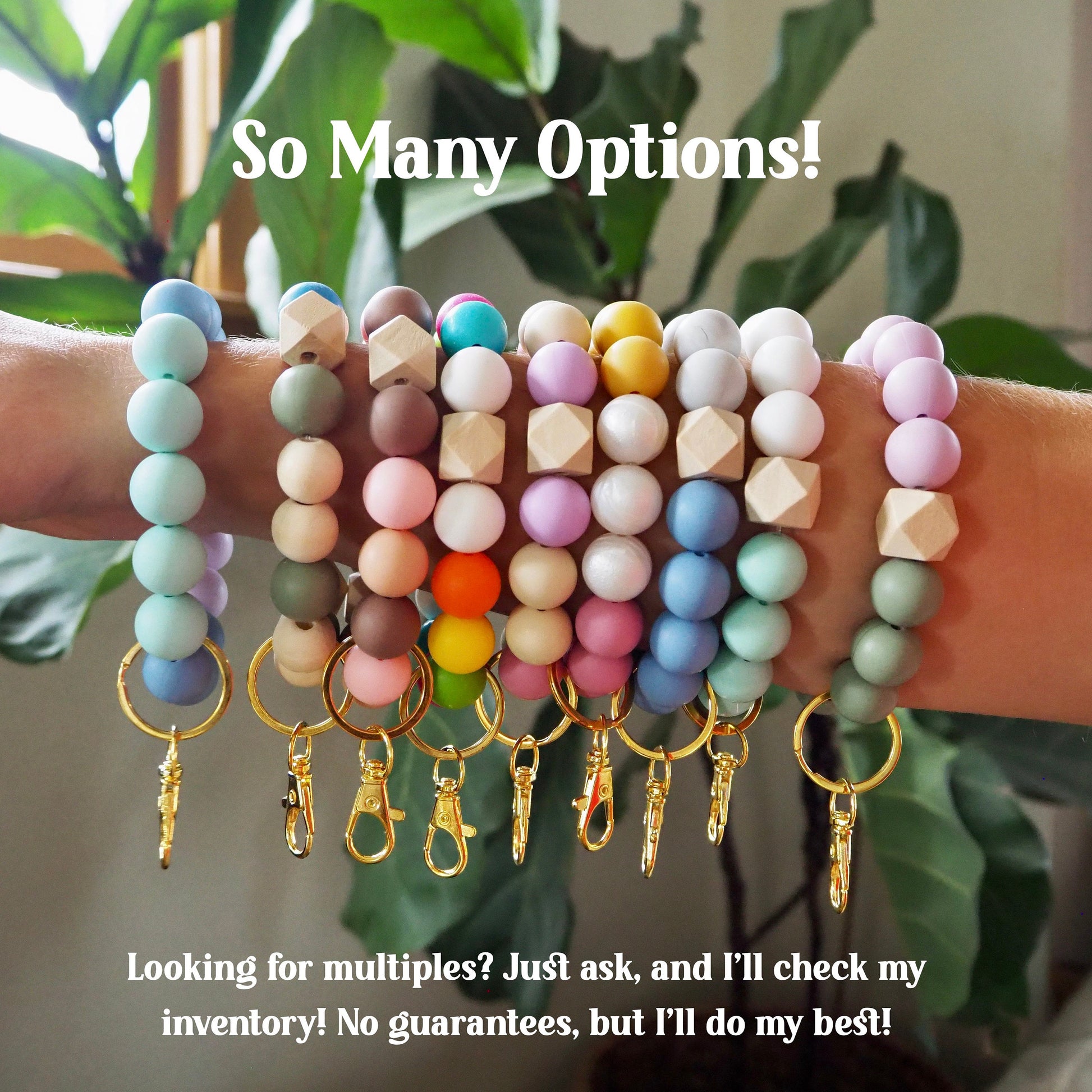 Most of the beads are soft silicone (so they feel great on your wrist), and the natural wood beads add a bit of earthy charm. Whether you're running errands, chasing after kiddos, or just trying to stay organized, these wristlets are a must-have accessory! Plus, they're cute enough to wear with any outfit.