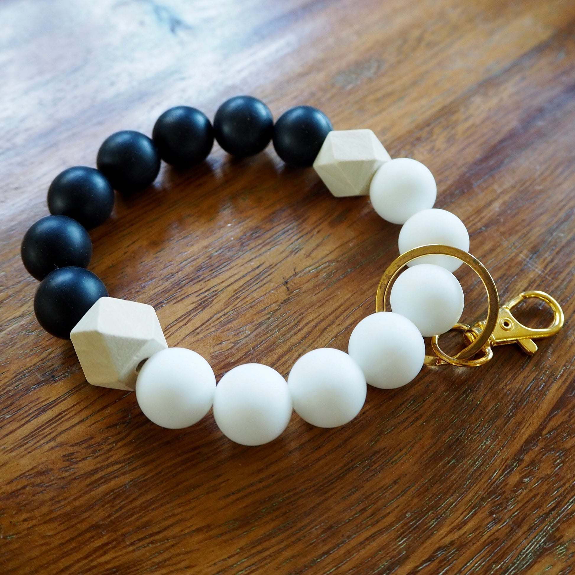Say goodbye to fumbling for your keys! These wristlets are handmade with love, featuring a playful mix of smooth silicone and natural, unfinished wood beads. Perfect for everyday use, they come with a gold clasp that easily hooks onto any set of keys, keeping them secure and always within reach.