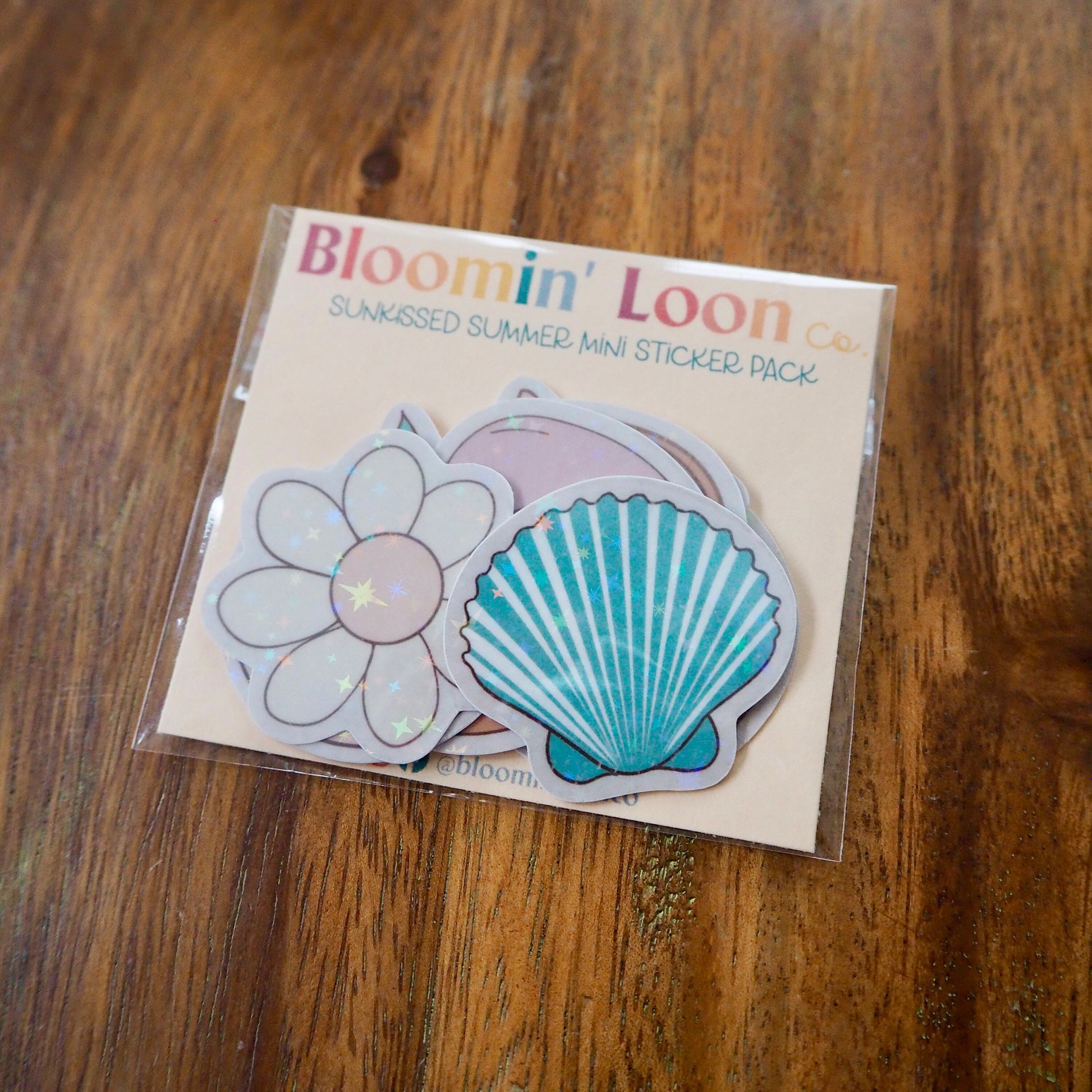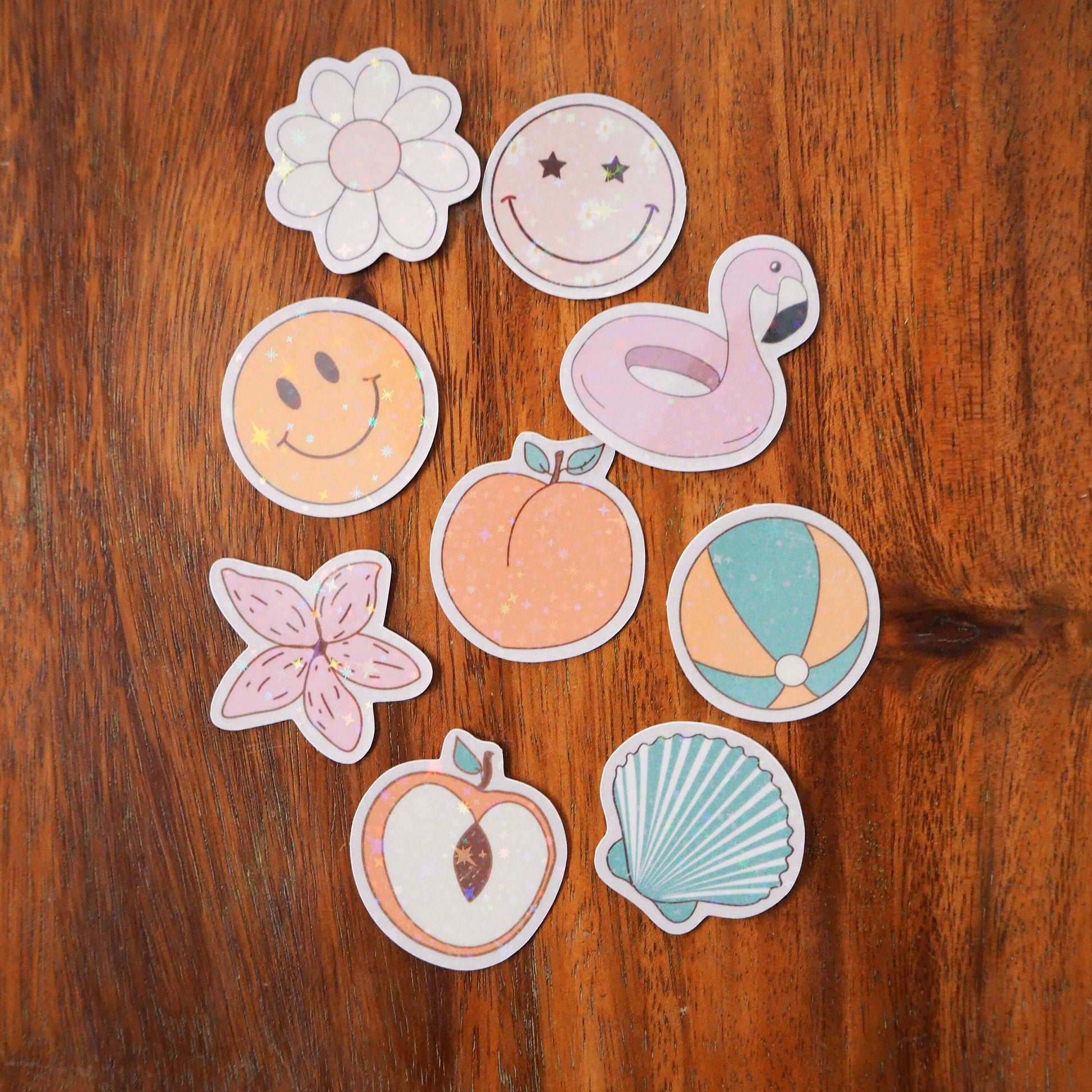 Dive into summer with the Sun-Kissed Summer mini sticker pack! Included are nine 1-1.5 inch stickers, each coated with a sparkly star lamination, these vinyl stickers are perfect for adding a little sunshine to your water bottle, laptop, etc. Prepare for the summer sunshine with this adorable sticker collection🌞✨